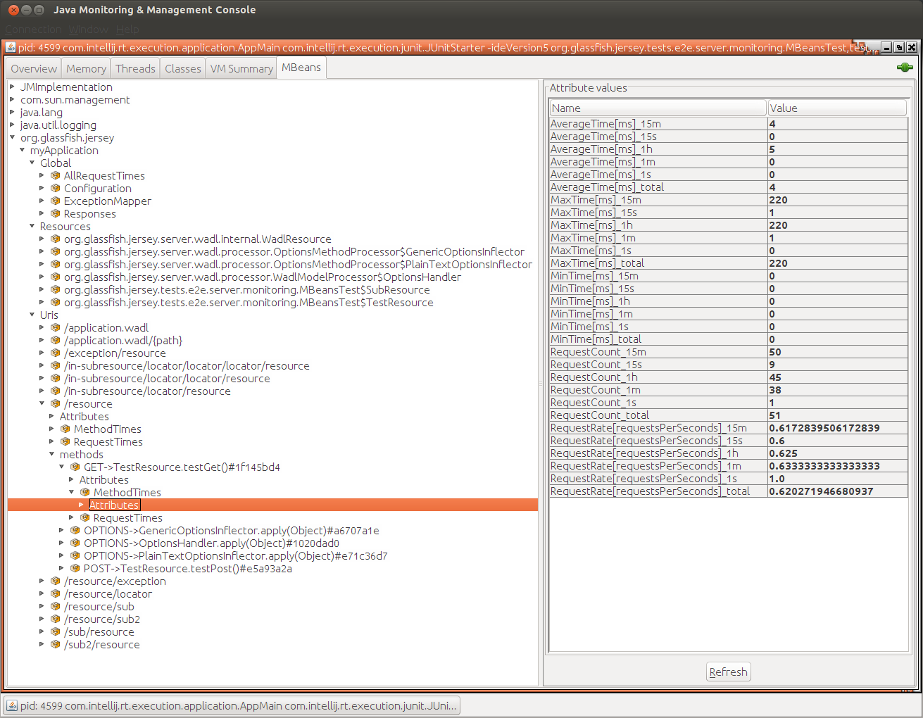 Jersey monitoring MXBeans can be accessed programmatically using JMX APIs or browsed via JMX-enabled